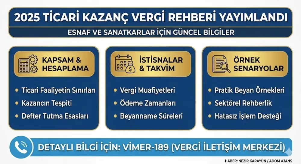 Anahtar Kelimeler: Ticari kazanç rehberi nedir, Vergi beyannamesi nasıl verilir, 2025 vergi takvimi nasıldır, VİMER 189 nedir, Nezir Karayün kimdir, Adom Ajans haberleri nelerdir, Vergi istisnaları nelerdir, Esnaf vergisini nasıl öder,